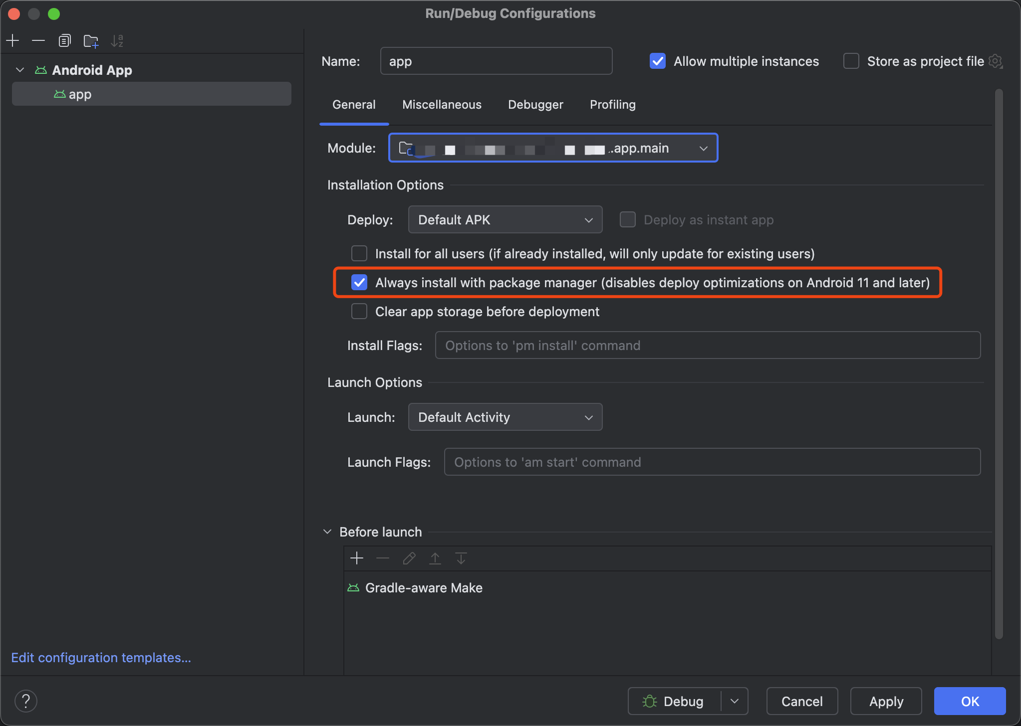 在 Run / Debug Configurations 里,勾选 Always install with package manager (disables deploy optimizations on Android 11 and later)。