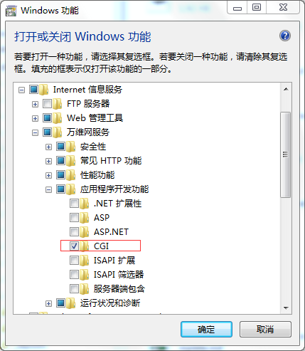打开「控制面板」–「程序」–「打开或关闭 Windows 功能」,勾选「Internet 信息服务」,确认「万维网服务」–「应用程序开发功能」–「CGI」是勾选状态,然后点「确定」安装。