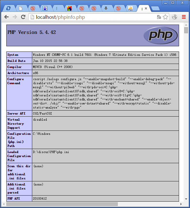 打开浏览器访问 http://localhost/phpinfo.php,如果能显示如下网页表示环境已经准备就绪。