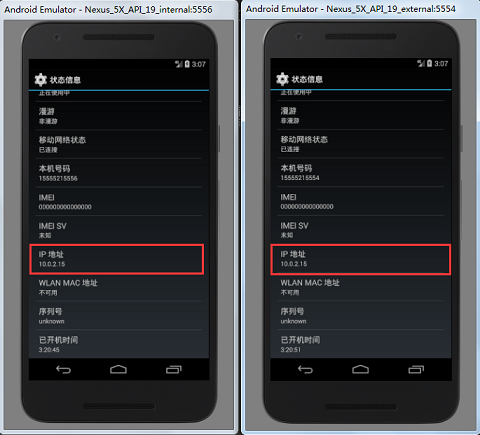 需要注意的是所有模拟器的网络地址分配都是一样的,这样一来,如果有两个模拟器同时运行在一台电脑上,它们都会有各自的路由,并且给两个模拟器分配的 IP 都是 10.0.2.15。它们被路由隔离,相互不可见。