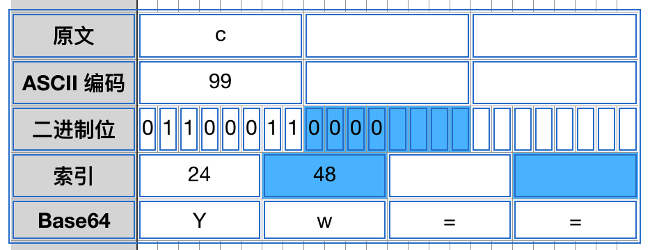如果最后剩下 2 个字节,那么将补 2 个 0 位,编码成 3 个 Base64 字符,然后补一个 =: