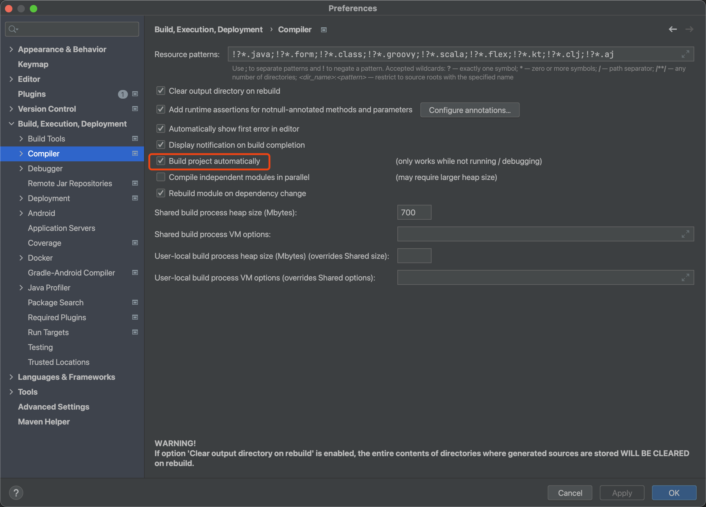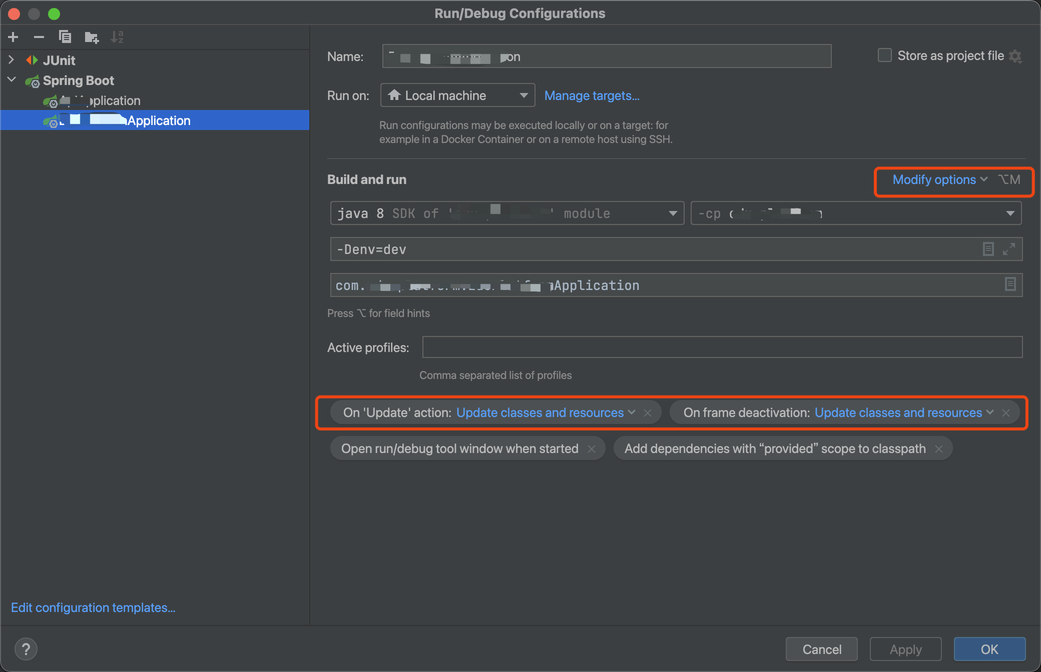 将 On ‘Update’ action: Update classes and resources 和 On frame deactivation: Update classes and resources 配置打开。