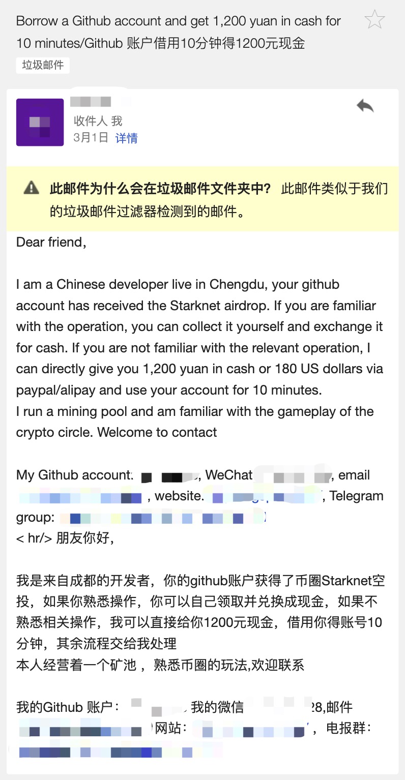 这应该是有人根据 GitHub 上的资格名单,批量获取到有资格领取空投的人的邮箱地址,然后群发的邮件。