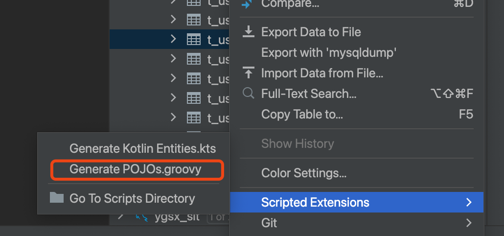 右键一个数据库表,依次选择 Scripted Extensions、Go to Scripts Directory,进入生成的脚本目录,找到 Generate POJOs.groovy,复制一份,重命名为 Generate MyBatis Code.groovy,然后修改内容如下: