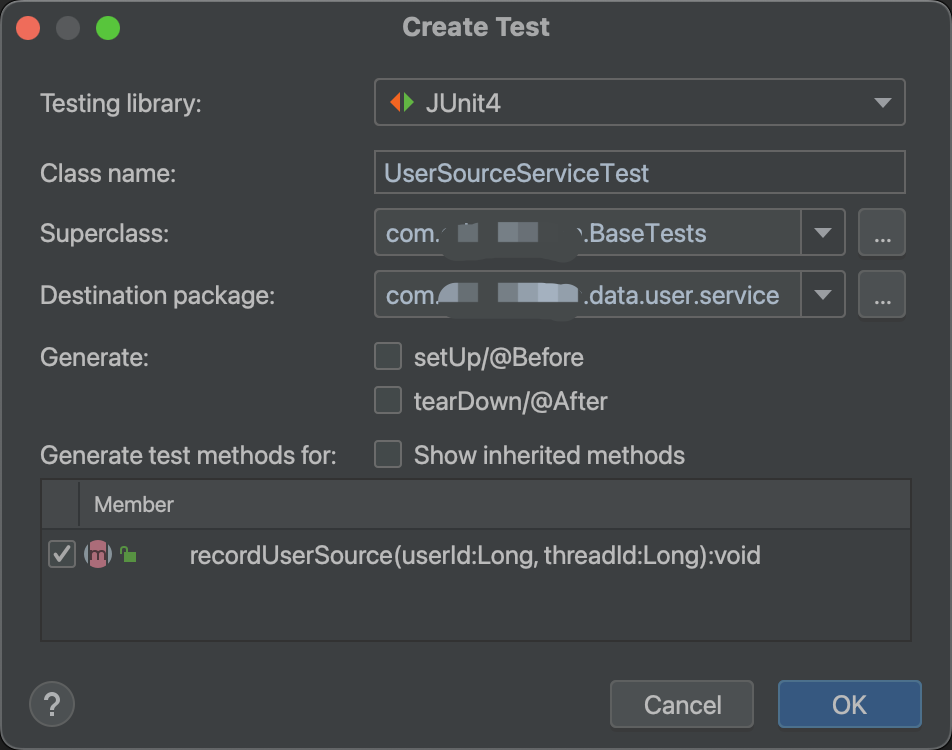 command + n 调出 Generate 菜单,然后选择 Test,配置测试类的名称、基类和包: